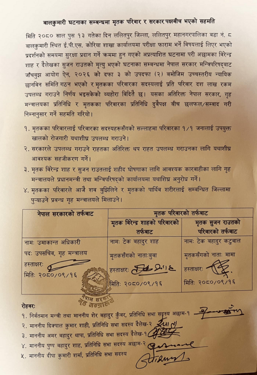 काठमाडौँ । बालकुमारी घटनाका पीडित परिवार र सरकारबीच चार बुँदे सहमति भएको छ । सरकार, गृह मन्त्रालयको प्रतिनिधि, मृतक परिवारका प्रतिनिधिबीच छलफल गरी सहमति गरिएको हो ।