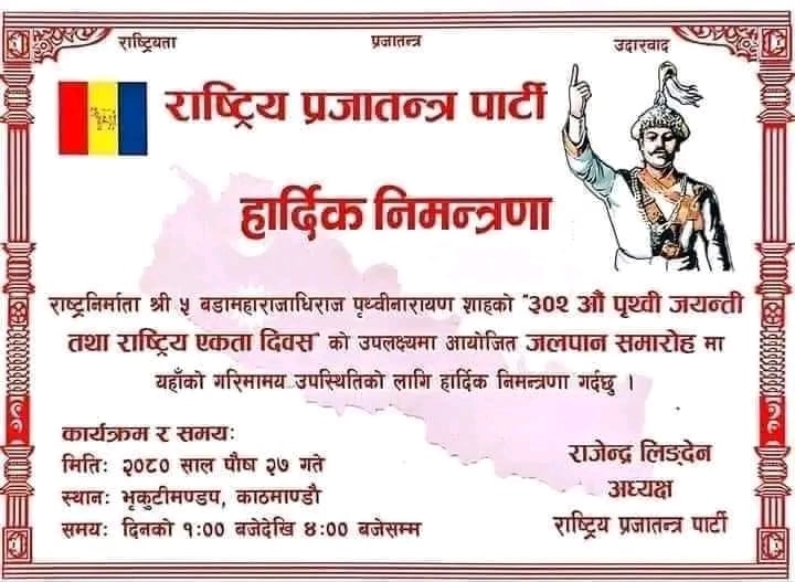 काठमाडौं । पृथ्वी जयन्तीको अवसरमा राप्रपा र राप्रपा नेपालले आज छुटाछुटै चियापान कार्यक्रमको आयोजना गरेका छन् । ३०२ औं पृथ्वी जयन्ती तथा राष्ट्रिय एकता दिवसको अवसरमा राप्रपा र राप्रपा नेपालले अलग अलग चियापान कार्यक्रमको आयोजना गरेका हुन ।