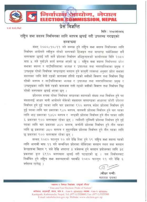 निर्वाचन आयोगका सहायक प्रवक्ता श्रीधर पन्थीले सातै प्रदेशका निर्वाचन अधिकृतको कार्यालयमा मतपत्र पठाइएको जानकारी दिए । उनका अनुसार प्रदेशसभाका सदस्यका लागि सेतो रङको कागजमा हरियो रङको मसीको मतपत्र छापिएको छ ।