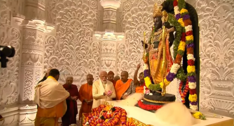 अयोध्या (भारत) । भारतका प्रधानमन्त्री नरेन्द्र मोदीको उपस्थितिमा सोमबार अयोध्याको श्री राम जन्मभूमि मन्दिरमा राम लल्लाको मूर्ति अनावरण गरिएको छ । मन्दिरको गर्भगृहमा भएको प्राण प्रतिष्ठा समारोहमा प्रधानमन्त्री मोदीले अनुष्ठानको नेतृत्व गरेका थिए । गहिरो भक्तिभावको वातावरणमा समारोहको आयोजना भएको हो ।