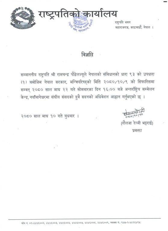राष्ट्रपतिले माघ २२ गते सोमबार अपराह्न ४ बजेका लाथि संसद् बैठक आह्वान गरेका छन् ।