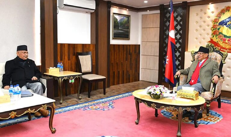 काठमाडौं । प्रधानमन्त्री पुष्पकमल दाहाल प्रचण्ड र नेकपा एमाले अध्यक्ष केपी शर्मा ओलीबिच भेटबार्ता भएको छ । सिंहदरबारस्थित प्रधानमन्त्री कार्यालयमा साे भेटबार्ता भएको हो । माघ २२ गते संसदको हिउँदे अधिवेसन सुरू हुनु अघि सो भेट भएको हो । संसद अधिवेसनको बिषयमा दुबै नेताबीच छलफल भएको हो ।