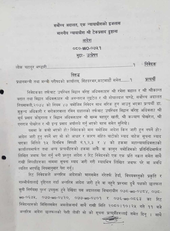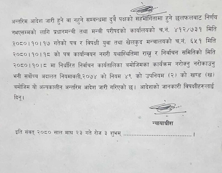 सोही रिटमाथि मंगलबार भएको प्रारम्भिक सुनुवाइमा निर्वाचन तालिका यथा अवस्थामै राख्न विपक्षीहरूका नाममा अल्पकालीन अन्तरिम आदेश जारी गर्दै अन्तरिम आदेश छलफलका लागि बोलाएको हो ।