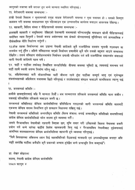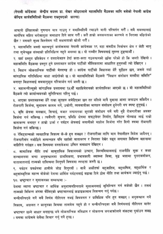 ‘हरेक तहका निर्वाचनमा अब उप्रान्त नेपाली कांग्रेसले कुनै राजनीतिक दलसंग चुनावी गठबन्धन वा तालमेल गर्नु हुँदैन । अहिले संविधानमा भएको निर्वाचन प्रणालीले कुनै पनि दलको बहुमत आउने सम्भावना देखिँदैन’, काेइरालाले भने, ‘तसर्थ संविधान संशोधनमार्फत निर्वाचन प्रणाली परिवर्तन गर्न सबै राजनीतिक दलहरूसँग संवादको लागी नेपाली कांग्रेसले पहल गर्नुपर्छ ।’
