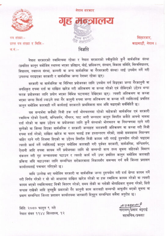 ‘सार्वजनिक एवं सरकारी स्वामित्व रहेको ऐलानी, सन्धिसर्पन, गौचरन, घाट जस्ता जग्गाहरू कानूनविपरीत कसैले आफ्नो नाममा दर्ता गरेको वा खास उद्देश्य वा प्रयोजनका लागि कुनै संस्थाको भोगचलन वा नियन्त्रणमा रहने गरी सुम्पेको वा जिम्मा दिएका सार्वजनिक र सरकारी जग्गाहरु बलजफ्ती अतिक्रमण वा कब्जा गरी निजी रुपमा दर्ता गरेको, दाखिल खारेज वा चलन चलाई हक हस्तान्तरण गरेको, लामो समयसम्म नियन्त्रण बाहिर रहने गरी लिजमा दिएको वा उद्देश्य विपरीत निजी कायम गरी गराई दुरुपयोग गरेको पाइएमा त्यस्तो कार्य गर्ने व्यक्तिलाई कानुनबमोजिम कारबाही गर्न,’ मन्त्रालयले जारी गरिएको विज्ञप्तिमा उल्लेख छ ।