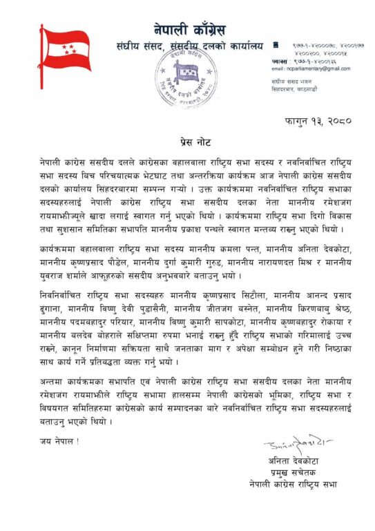 आइतबार कांग्रेसबाट नवनिर्वाचित राष्ट्रियसभा सदस्यहरूसँगको परिचयात्मक कार्यक्रममा नेता सिटौलाले पार्टीहरूलाई शान्ति र लोकतन्त्रको धारमा रुपान्तरण गर्नु कांग्रेसको नेतृत्वदायी दायित्व भएको बताए ।
