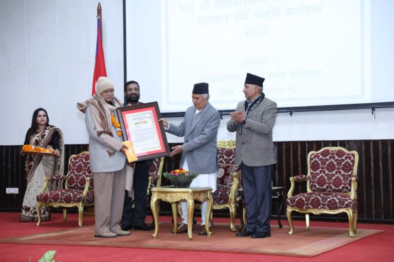 काठमाडौं । राष्ट्रपति रामचन्द्र पौडेलले ‘महेन्द्रनारायण निधि राष्ट्रिय पुरस्कार तथा सम्मान–२०८०’ पूर्वराष्ट्रपति डा रामवरण यादवलाई प्रदान गरेका छन् ।