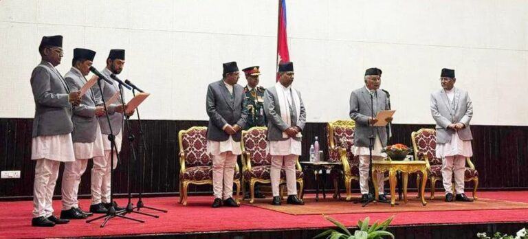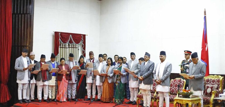 काठमाडौं । सरकारका नवनियुक्त मन्त्रीहरुले पद तथा गोपनियताको शपथ लिएका छन् । शीतल निवासमा आयोजित विशेष समारोहमा राष्ट्रपति रामचन्द्र पाैडेलले उनीहरुलाई शपथ ग्रहण गराएका हुन् ।