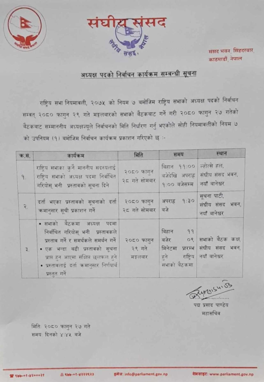काठमाडौँ । राष्ट्रिय सभा अध्यक्षको निर्वाचनका लागि आज उम्मेदवारी दर्ता हुँदैछ। संघीय संसद् सचिवालयले फागुन २९ गते (भोलि)का लागि निर्वाचनको तालिका सार्वजनिक गरेको छ । तालिकाअनुसार आज बिहान ११ बजे देखि दिउँसो १ बजेसम्म उम्मेदवारी दर्ताको समय निर्धारण गरिएको छ ।