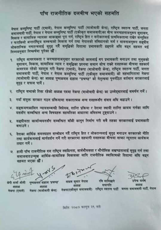 त्यो लिखित सहमतिमा माधवकुमार नेपाल नेतृत्वको एकीकृत समाजवादी समावेश थिएन । तर मंगलबार एकीकृत समाजवादी समेत थपिएर पाँच दलबीच ७ बुँदे सहमतिपत्रमा हस्ताक्षर भएको छ ।