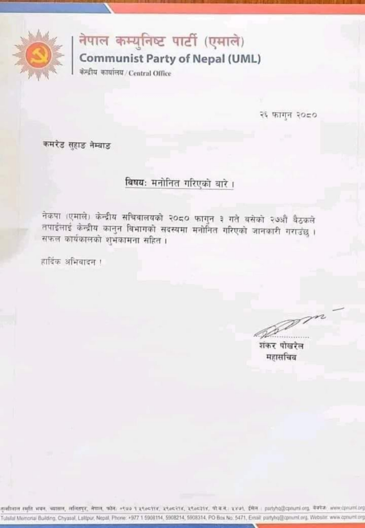 काठमाडौं । नेकपा एमालेले संविधान सभा अध्यक्ष स्वर्गीय सुवास नेम्वाङका पुत्र अधिवक्ता सुहाङ नेम्वाङलाई केन्द्रीय कानून विभागको सदस्यमा मनोनीत गरेको छ ।