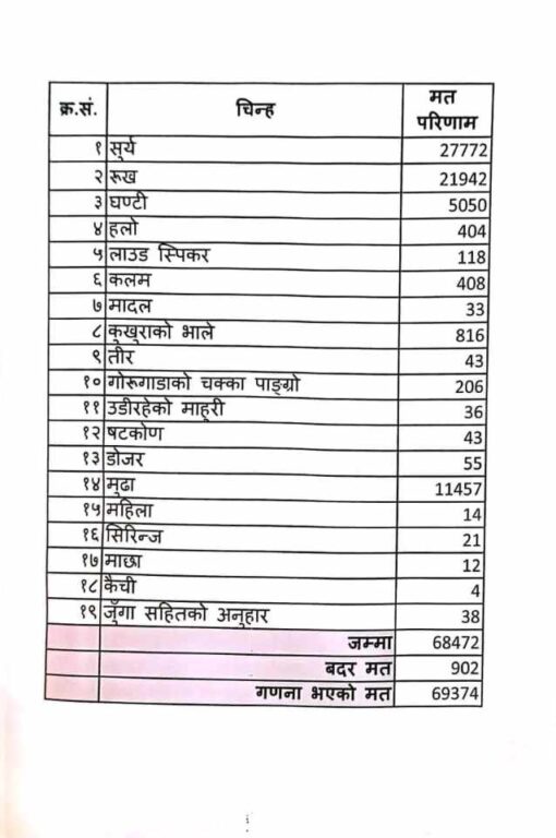 १९ जना चुनावी प्रतिस्पर्धामा उत्रिएको यस उपनिर्वाचनमा स्वतन्त्र उम्मेदवार डेकेन्द्रसिंह थेगिमले ११ हजार ४५७ मत प्राप्त गर्नुभयो । यस्तै राष्ट्रिय स्वतन्त्र पार्टीका उम्मेदवार मिलन लिम्बूले भने ५ हजार ५० मतमा चित्त बुझाउनुपर्यो ।
