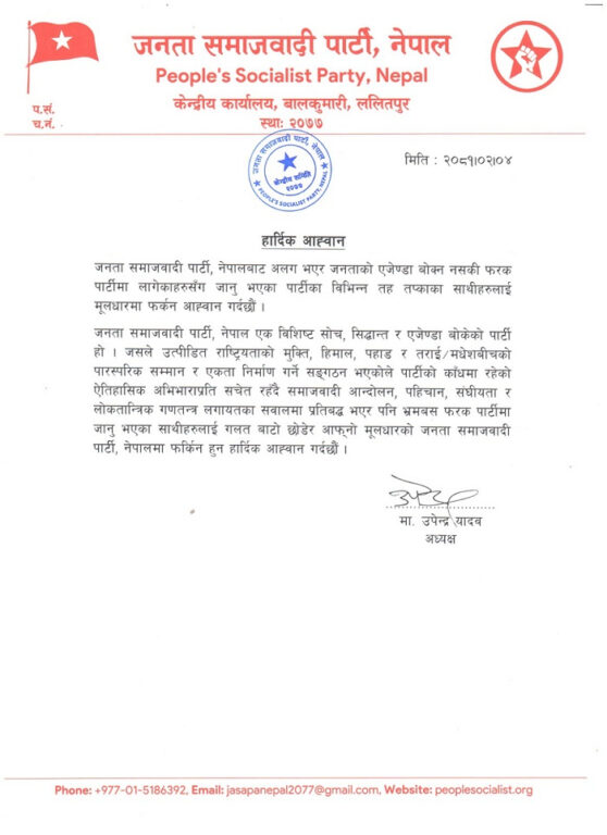 अध्यक्ष यादवले शुक्रबार एक विज्ञप्ति जारी गर्दै सबै नेता कार्यकर्ताहरुलाई पार्टीको मूलधारमा आउन एकताबद्ध भएर पार्टीलाई अघि बढाउन आग्रह गरेका हुन् ।