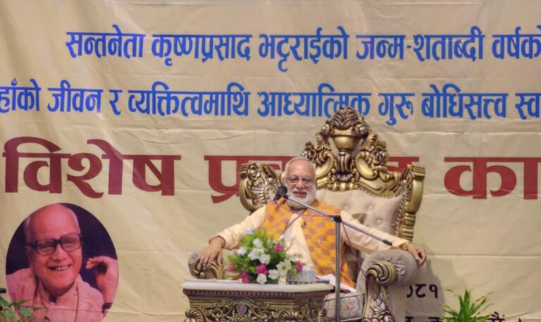 काठमाडौं । पूर्व प्रधानमन्त्री, प्रजातान्त्रिक आन्दोलनका महानायक, नेपाली कांग्रेसका संस्थापक नेता कृष्णप्रसाद भट्टराईको जन्म शताब्दी वर्षको पावन अवसरमा सन्तनेता कृष्णप्रसाद भट्टराई केन्द्रले शनिबार राजधानीमा विशेष प्रवचन कार्यक्रम आयोजना गरेको छ । कार्यक्रममा भट्टराईको जीवन र व्यक्तित्वमाथि अत्यन्त निकट आध्यात्मिक गुरु बोधिसत्व स्वामी आनन्द अरुणले विविध कोणबाट प्रकाश पारेका थिए ।