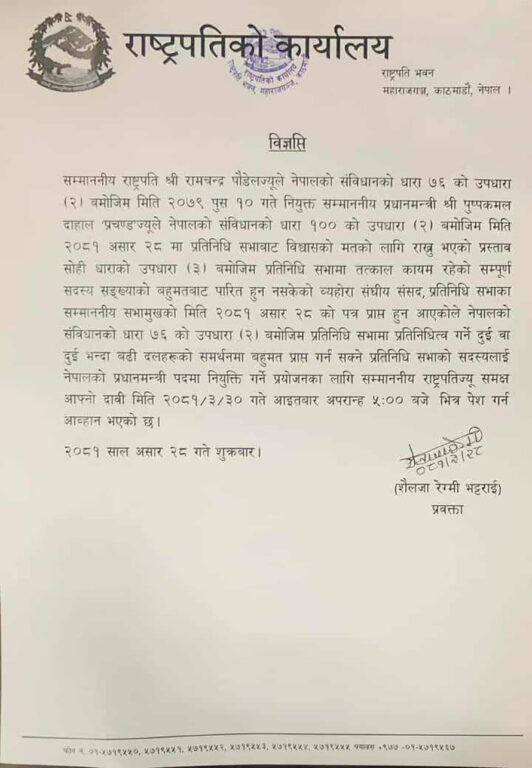 राष्ट्रपति पौडेलले आइतबार ५ बजेसम्मको समय दिएर सरकार गठनको दाबि पेश गर्न भनेका छन् ।