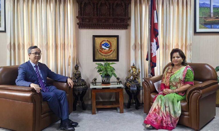 काठमाडौं । परराष्ट्रमन्त्री आरजु राणा देउवासँग नेपालका लागि चिनियाँ राजदूत चेन सङले शिष्टाचार भेटेका छन् ।