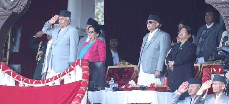 काठमाडौं । राष्ट्रपति रामचन्द्र पौडेल महाशिवरात्रि तथा २६२ औँ सेना दिवसका अवसरमा नेपाली सेनाद्वारा सैनिक मञ्च टुँडिखेलमा आज आयोजित विशेष समारोहमा सरिक भई बढाइँ तथा सैनिक कला प्रदर्शनी अवलोकन गरेका छन् । सो अवसरमा नेपाली सेनाद्वारा उनको सम्मानमा राष्ट्रपति सलामी अपर्ण गरिएको थियो ।