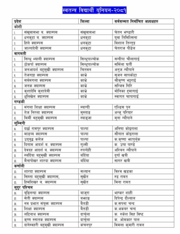 नेपाली कांग्रेसको भ्रातृ संस्था नेविसंघबाट २८ क्याम्पसमा र प्रमुख प्रतिपक्ष दल नेकपा माओवादी केन्द्रको विद्यार्थी संगठन अखिल (क्रान्तिकारी) बाट २१ जना स्ववियु अध्यक्ष निर्विरोध भएका छन् ।