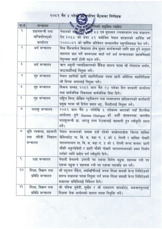 बैठकले जनक शिक्षा सामग्री केन्द्र लिमिटेडको प्रबन्ध सञ्चालक पदनमा अर्घाखाँचीका यदुनाथ पौडेललाई नियुक्त गर्न सञ्चालक समितिलाई निर्देशन दिएको छ । यस्तै शिक्षक सेवा आयोगको सदस्यमा सुर्खेत स्थायी घर भएका पवित्रा सुवेदी र रामशरण सापकोटालाई नियुक्त गर्ने निर्णय भएको छ ।