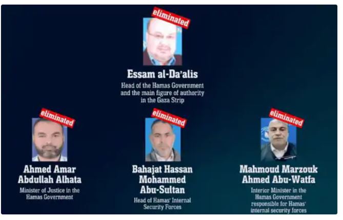जसमा हमासका कमाण्डर तथा राजनीतिक नेता महमूद मारजुक अहमद अबु वत्फा, बहजत हसन मोहम्मद अबु सल्तान र अहमद ओमर अब्दुल्लाह अल हता रहेका छन ।