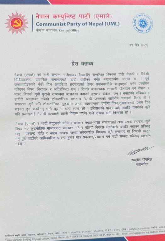 काठमाडौं । नेकपा एमालेले आफ्नो पार्टी र सरकार वर्तमान नेपाल–भारत सम्बन्धलाई अझ प्रगाढ बनाउन प्रतिबद्ध रहेको जनाएको छ । एमाले महासचिव शंकर पोखरेलले सोमबार एक विज्ञप्ति जारी गर्दै कुनै विषय भए कूटनीतिक माध्यमबाट समाधान गरिने र बलियो विकास साझेदारी अगाडि बढाइने बताए ।