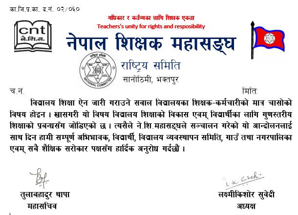 महासङ्घले भनेको छ–’विगतका सबै सहमति सम्बोधन गरी गुणस्तरीय विद्यालय शिक्षा, विद्यार्थी र शिक्षक-कर्मचारी मैत्री विद्यालय शिक्षा ऐन अविलम्ब जारी गर्न राज्यलाई बाध्य पार्न नेपाल शिक्षक महासङ्घको आयोजनामा हुँदै गरेको काठमाडौँ केन्द्रित शैक्षिक सडक आन्दोलन उत्कर्षमा छ । यस्तो बेला यो आन्दोलनलाई अन्तिम र निर्णायक बनाउन सबै शिक्षक तथा विद्यालय कर्मचारी आन्दोलनमा जुट्नु अनिवार्य हुन्छ । त्यसैले देशभरका सबै विद्यालय पूर्णरुपमा बन्द गरी काठमाडौँ आउनुहुन सबै शिक्षक-कर्मचारी साथीहरूमा पुनः अनुरोध गर्दछौँ ।’