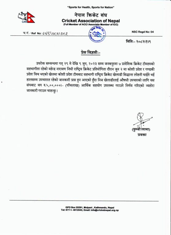 क्यानले बिहीबार एक विज्ञप्ति जारी गर्दै सन् २०२३ मा भएको महेन्द्र नारायण निधि राष्ट्रिय क्रिकेट प्रतियोगितामा घाइते भएका सिद्धान्तलाई पाँच लाख दिने निर्णय गरेको हो ।