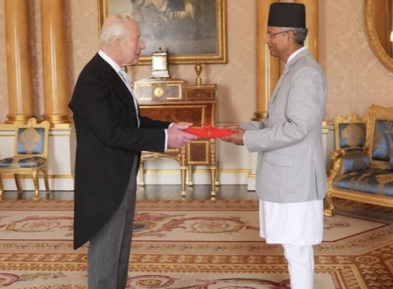 काठमाडौं । संयुक्त अधिराज्यका लागि नेपालका राजदूत चन्द्रकुमार घिमिरेले राजा चाल्र्स तृतीयसमक्ष आफ्नो ओहोदाको प्रमाणपत्र प्रस्तुत गरेका छन् । बकिङ्घम राजप्रासादमा बिहीबार अपराह्न आयोजित विशेष समारोहमा उनले आफ्नो ओहोदाको प्रमाणपत्र प्रस्तुत गरेका हुन् ।