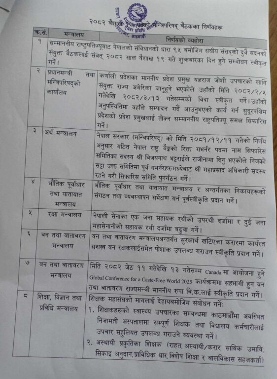 बुधबार बसेको बैठकले नेपाल सरकार (मन्त्रिपरिषद्)को २०८१/१२/११ गतेको निर्णयअनुसार गठित नेपाल राष्ट्र बैंकको रिक्त गभर्नर पदमा ना सिफारिस समितिका सदस्य विजयनाथ भट्टराईले राजीनामा दिएकाले निजको सट्टा उक्त समितिका पूर्व गभर्नरहरुमध्येबाट महाप्रसाद अधिकारी सदस्य रहनेगरी सिफारिस समिति पुनर्गठन गर्ने निर्णय गरेको छ ।