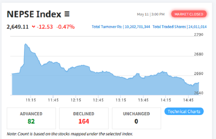 योसँगै २६४९.११ अंकमा कायम भएको छ । आज बजारमा १० अर्ब २० कारेड रुपैयाँ बराबरको कारोबार भएको छ ।