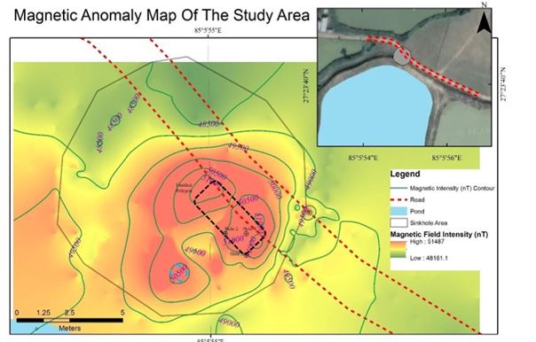 भूगर्वविद्हरुको अध्ययन नतिजा अनुसार सिन्कहोलको केन्द्रदेखि भासिएको सडकको पूर्वी भागमा ४-२ मिटरको क्षेत्रफलमा उच्च चुम्बकीय असामान्यता देखाएको छ । यो संकेत भासिएको गाडीको सम्भावित स्थानसँग मिल्दोजुल्दो देखिएको भूगर्भविद्हरूले बताएका छन् ।