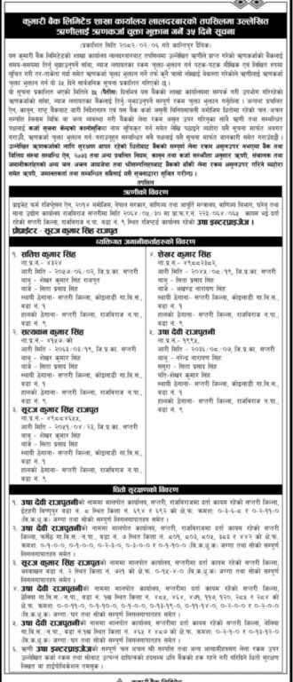सिंहले कुमारी बैंकको शाखा कार्यालय लालदरबारबाट लिएको ऋण चुक्ता नगरेपछि बैंकले ३५ दिने सूचना सार्वजनिक गरेको हो।