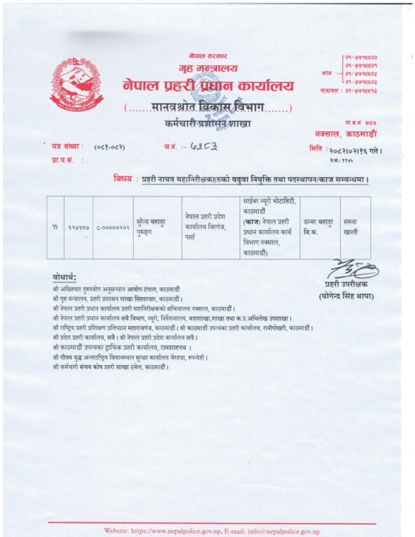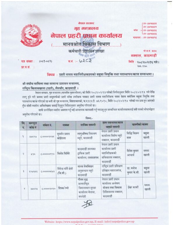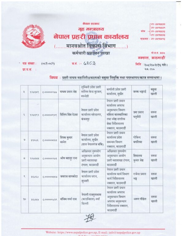 दिलीपसिंह देउवाको महिला बालबालिका तथा ज्येष्ठ नागरिक सेवा निर्देशनालय, दीपककुमार बस्नेतको प्रदेश समन्वय विभाग, ओमबहादुर रानाको अख्तियार दुरुपयोग अनुसन्धान आयोग, जयराज सापकोटाको कार्य विभाग, सञ्जीव शर्मा दासको अपराध अनुसन्धान विभाग र सुरेन्द्र गुरुङको प्रहरी प्रधान कार्यालय कार्य विभागमा सरुवा भएको छ।