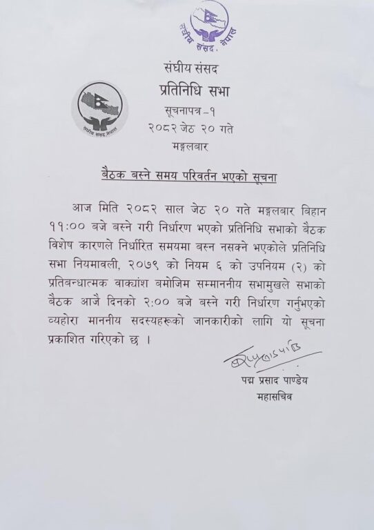 काठमाडौं । प्रतिनिधिसभा बैठक तीन घण्टापछि सारिएको छ । सत्तापक्ष र प्रतिपक्षीबीच सदन सञ्चालनका सम्बन्धमा सहमति नभएपछि बिहान ११ बजेका लागि बोलाइएको बैठक दिउँसो एक बजे सूचना टाँसेर दुई बजेसम्मका लागि सारिएको सभामुख देवराज घिमिरेको सचिवालयले जानकारी दिएको छ ।