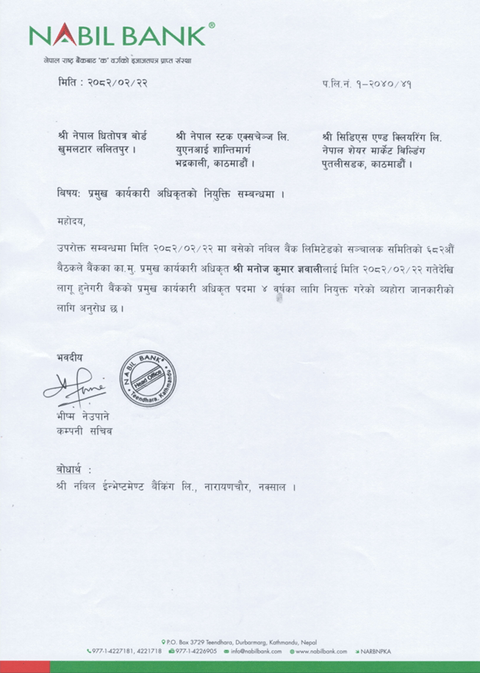काठमाडौं । नबिल बैंकको प्रमुख कार्यकारी अधिकृत (सीईओ)मा मनोज ज्ञवाली नियुक्त भएका छन् ।