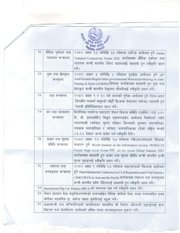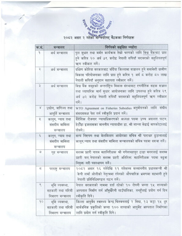 बैठकले वैदेशिक रोजगार न्यायाधीकरणको अध्यक्ष पदमा उच्च अदालत पाटन अन्तर्गत हेटौंडा इजलासका न्यायाधीश डा. शान्ता सेढाईलाई तोक्ने निर्णय गरेको छ भने सशस्त्र प्रहरी नायब महानिरीक्षक गणेशबहादुर ठाडा मगरलाई सशस्त्र प्रहरी बल नेपालको सशस्त्र प्रहरी अतिरिक्त महानिरीक्षक पदमा बढुवा नियुक्त गरी पदस्थापन गर्ने निर्णय गरेको छ ।