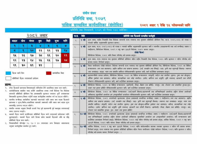 क्यालेन्डरमा असार १० गतेसम्म निरन्तर र त्यसपछि १४ गते बैठक बस्ने उल्लेख छ । यद्यपि रास्वपाको सदन अवरोधका कारणले क्यालेन्डरमा भएअनुसार आज बैठक बसेको छैन । ६ गते प्रधानमन्त्रीसँग प्रश्नोत्तर, ७ र १४ गते शनिबार पनि बैठक बस्ने क्यालेन्डरमा उल्लेख छ ।