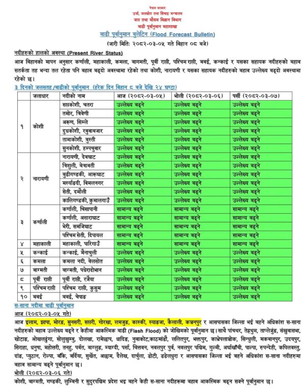 यस्तै महाशाखाले काठमाडौं उपत्यकासहित ५६ जिल्लामा रहेका नदीमा बहाव सामान्य बढ्ने अनुमान रहेकाले सामान्य सतर्कता अपनाउन सुझाव दिएको छ ।