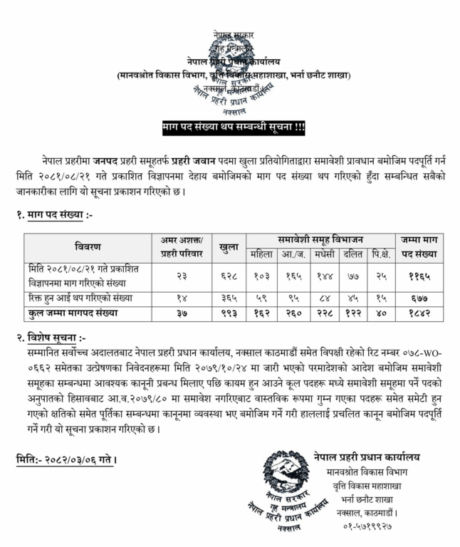 प्रहरी प्रधान कार्यालय, मानवस्रोत विकास विभागले एक सूचना जारी गर्दै सर्वोच्च अदालतको आदेश कार्यान्वयन गर्नका लागि पहिले माग गरिएको १ हजार १६५ पदमा थप ६७७ पद थप गर्ने निर्णय गरिएको जानकारी दिएको हो ।
