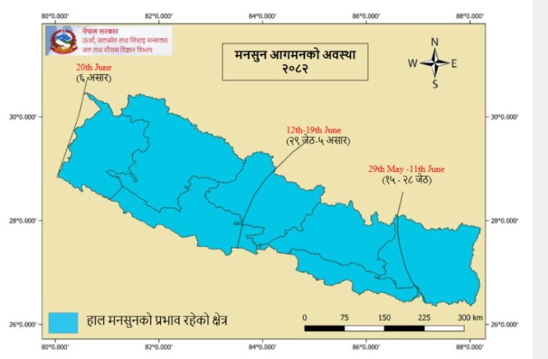 “नेपालमा यस वर्षको मनसुन मिति जेठ १५ गते देशको पूर्वी भू–भागबाट प्रवेश गरी कोसी प्रदेशको अधिकांश भू–भागमा विस्तार भएको थियो,” जल तथा मौसम विज्ञान विभागले भनेको छ, “जेठ २९ गते मधेस, वाग्मती, गण्डकी प्रदेशका केही भूभाग र लुम्बिनी प्रदेशका पूर्वी क्षेत्रका थोरै भूभागसम्म विस्तार भएको थियो ।”