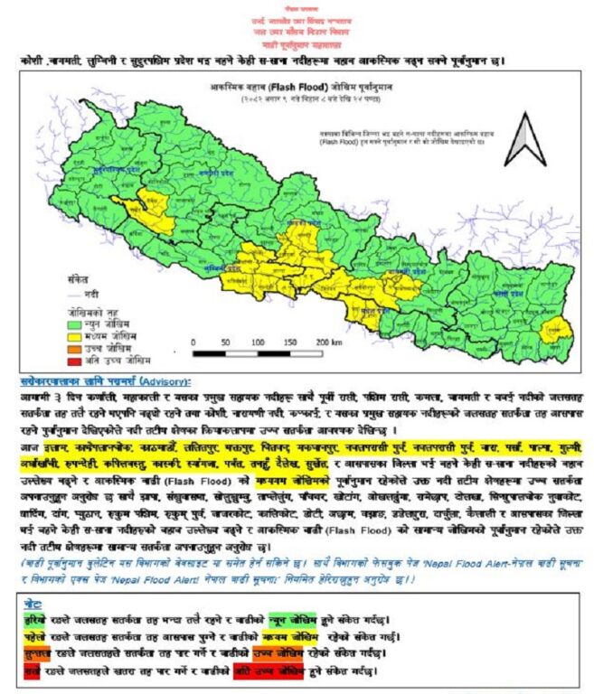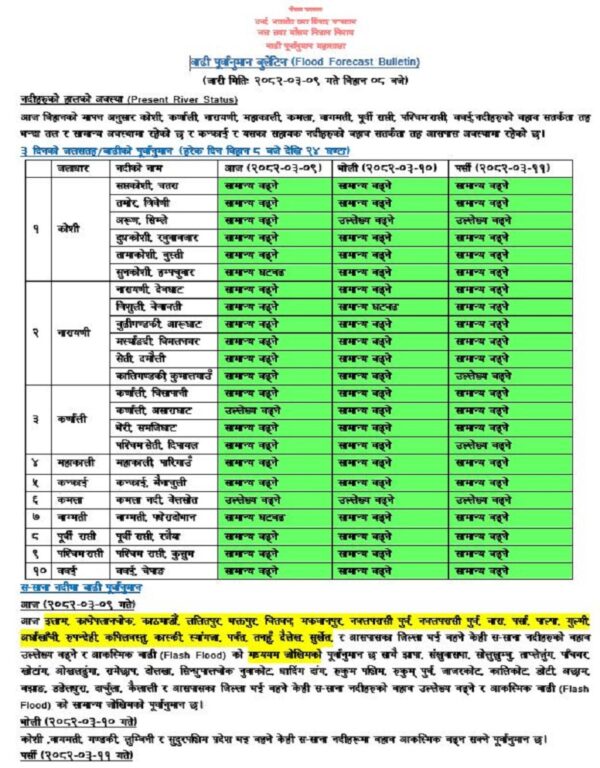 आज, भोलि र पर्सि कर्णाली, महाकाली र यसका प्रमुख सहायक नदी तथा पूर्वी राप्ती, पश्चिम राप्ती, कमला, बागमती र बबई नदीको जलसतह सतर्कता तह तलै रहने भए पनि बढ्दो रहने तथा कोशी, नारायणी, कन्काई, र यसका प्रमुख सहायक नदीहरूको जलसतह सतर्कता तह आसपास रहने सम्भावना रहेको महाशाखाले जनाएको छ ।