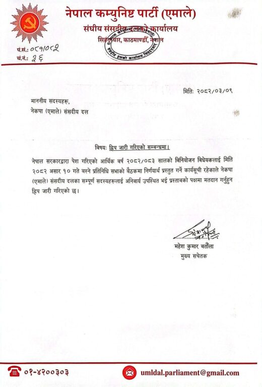 ‘नेपाल सरकारद्वारा पेस गरिएको आर्थिक वर्ष २०८२/०८३ सालको विनियोजन विधेयकलाई २०८२ असार १० गते बस्ने प्रतिनिधि सभाको बैठकमा निर्णयार्थ प्रस्तुत गर्ने कार्यसूची रहेकाले नेकपा (एमाले) संसदीय दलका सम्पूर्ण सदस्यहरूलाई अनिवार्य उपस्थित भई प्रस्तावको पक्षमा मतदान गर्नुहुन ह्विप जारी गरिएको छ,’ बर्तौलाले जारी गरेको ह्विपमा भनिएको छ ।