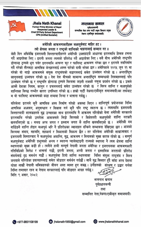 काठमाडौं । नेकपा एकीकृत समाजवादीका सम्मानित नेता झलनाथ खनालले अमेरिकाले इरानमाथि आक्रमण गरेर २०२५ जुन २१ मा गरेको संयुक्त राष्ट्रसंघको बडापत्रलाई समेत उल्लङ्घन गरेको बताएका छन् ।