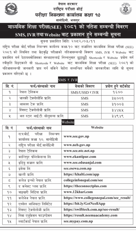यस वर्षको एसईई परीक्षा चैत ७ गतेदेखि सञ्चालन भएको थियो, जहाँ नियमिततर्फ ४ लाख ३१ हजार ४६६ र ग्रेड वृद्धितर्फ ६७ हजार ७१५ परीक्षार्थी सहभागी भएका थिए। नतिजा प्रकाशनका लागि सरकारी तथा निजी क्षेत्रका विभिन्न संस्थालाई स्वीकृति प्रदान गरिएको छ।