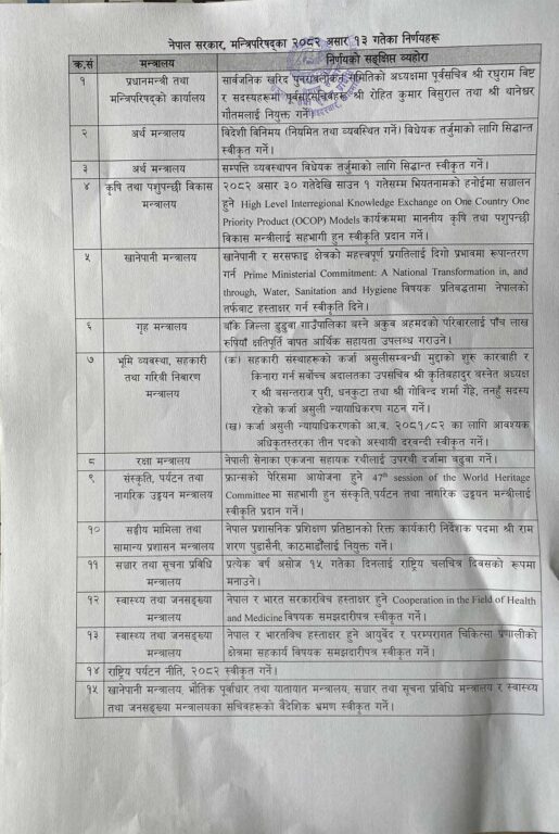 काठमाडाैं । मन्त्रिपरिषद् बैठकले १५ निर्णय सार्वजनिक गरेको छ । सरकारका प्रवक्ता एवम् सञ्चार तथा सूचना प्रविधिमन्त्री पृथ्वीसुब्बा गुरुङले यही असार १३ गते बसेको मन्त्रिपरिषद् बैठकले १५ वटा निर्णय गरेको जानकारी दिए ।