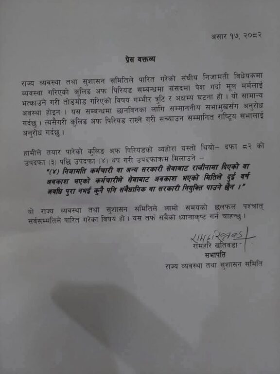 सभापति खतिवडाले हस्ताक्षर गरेको विज्ञप्तिमा भनिएको छ, यो राज्य व्यवस्था तथा सुशासन समितिले लामो समयको छलफलपश्चात् सर्वसम्मतिले पारित गरेका विषय हो । यसतर्फ सबैको ध्यानाकृष्ट गर्न चाहन्छु ।’