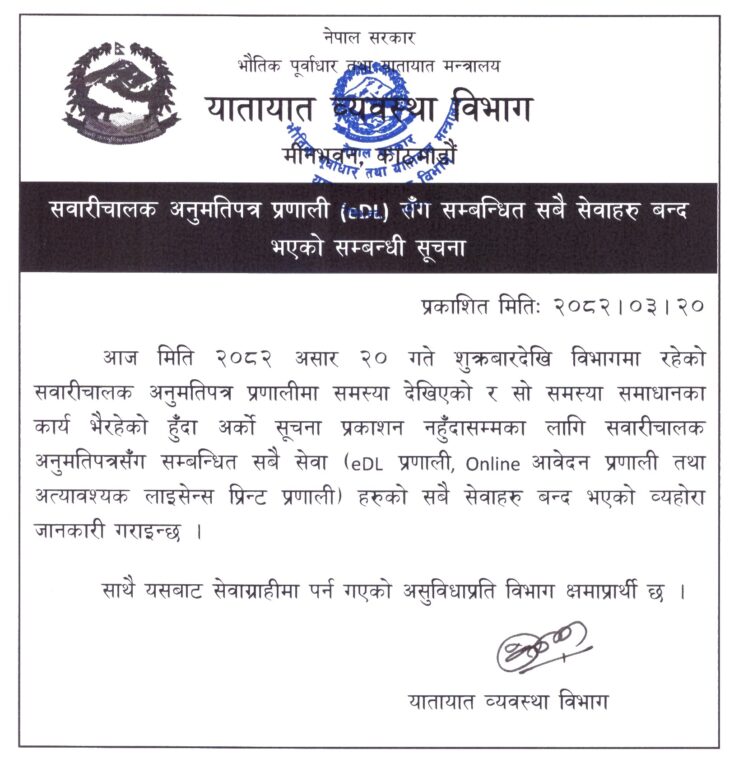 सूचनामा भनिएको छ, “२०८२ साल असार २० गते शुक्रबारदेखि सवारी चालक अनुमतिपत्र प्रणालीमा समस्या देखिएकाले समस्या समाधान नभएसम्मका लागि सम्बन्धित सबै सेवा बन्द गरिएको जानकारी गराइन्छ।”