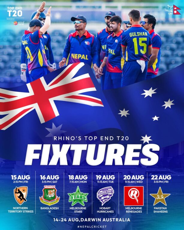टी–२० शृङ्खलामा नेपालले नर्दन टेरिटोरी स्ट्राइक्ससहित बङ्गलादेश ‘ए’, पाकिस्तान ए’ र बिग बाश लिगका तीन टोलीहरू मेलबर्न स्टार्स, होबार्ट हरिकेन्स र मेलबर्न रेनेगेड्ससँग खेल्नेछ ।