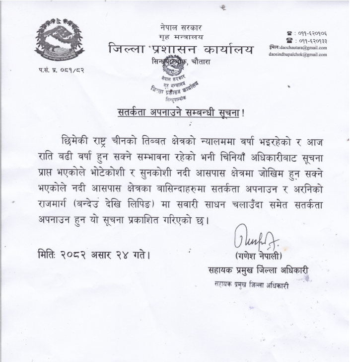 प्रशासनद्वारा जारी सूचनामा भनिएको छ, ‘भोटेकोशी र सुनकोशी नदी आसपास क्षेत्रमा जोखिम हुन सक्ने भएकोले नदी आसपास क्षेत्रका बासिन्दाहरूमा सतर्कता अपनाउन र अरनिको राजमार्ग (बन्देउदेखि लिपिङ) मा सवारी साधन चलाउँदा समेत सतर्कता अपनाउन हुन यो सूचना प्रकाशित गरिएको छ ।’