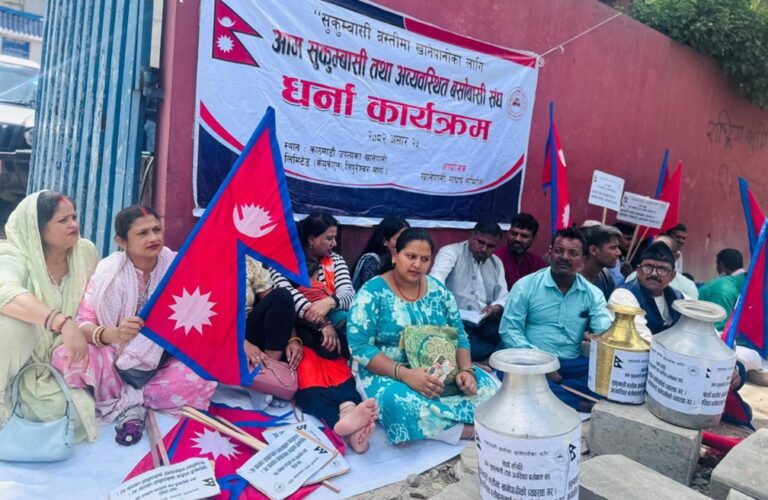 काठमाडौं । आम सुकुम्बासी तथा अव्यवस्थित बसोबास संघले खानेपानीको माग गर्दै आज (आईतबार) पाँचौदिन पनि काठमाडौं उपत्यका खानेपानी लिमिटेड (केयूकेएल) को कार्यालय घेराउ एवं धर्ना दिइएको छ । कार्यालय अगाडी धर्ना दिदै उनीहरुले सरकारका बिरुद्धमा चर्को नाराबाजी गरेका छन् ।